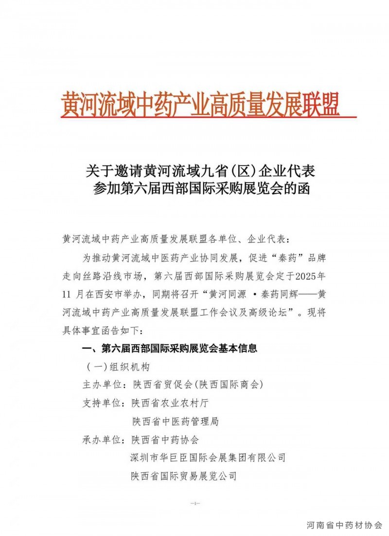 关于邀请黄河流域九省(区)企业代表参加第六届西部国际采购展览会的函
